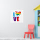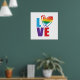 Gay pride themed square poster features large colourful LOVE typography with rainbow scribble heart