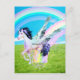 A digital painting of a colourful flying unicorn landing on grass after creating rainbows in the sky with her magic.