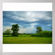 A beautiful photograph of stormy clouds passing by trees and fields.