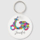 This personalized keychain is perfect for keeping the keys to your moped secure. The custom keychain features an illustration of a classic motorized scooter in bright, rainbow colours in a fun painted style. Your name is below in modern black, script lettering. This keychain makes a fun gift for new scooter owners.