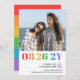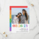 Modern typography gay or lesbian save the date with your wedding date written in large bold numbers in rainbow colours beneath a photo of the happy couple. Add names and additional information in elegant fonts. The back features rainbow stripes.