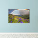 This photo features a rainbow over a field of bluebonnet wildflowers in the shadow of a mountain range.