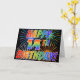 The front of this eye-catching, exciting and vibrant greeting card design features a colorful celebratory fireworks inspired pattern, along with the message "HAPPY 14TH BIRTHDAY!" having a multicolored rainbow like gradient pattern, on a black colored background. The inside features a personalized greeting message, or could perhaps be cleared and left blank if it is desired to write a message by hand instead. A greeting card like this might be a happy, fun way of sending a greeting message to somebody who is celebrating their 14th birthday. [~Z0000355]
