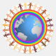 A rainbow surrounds the Earth, and a rainbow of people join hands around it. Celebrate your true selves, and love one another.