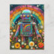 An adorable rainbow robot in a flower meadow with a rainbow in an encaustic looking mixed media style
