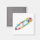 A rainbow safety pin design. The outline is black ink, drawn with a loose sketchy feel. Splashes of rainbow paint (violet, indigo, blue, green, yellow, orange and red) colour the pin and wash out into the background. Though it looks like watercolour, it's actually diluted acrylic paint.