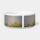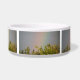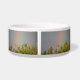 This awesome pet bowl features a beautiful landscape photo of a rainbow over the top of some trees. The photograph was taken immediately after a rainstorm to capture the vivid colours of the rainbow. The surrounding sky is grey with cloud cover.