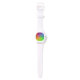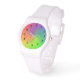 Here is a colourful watch with an abstract spiral rainbow pattern swirling around a central target in spectrum colours of green, blue, yellow, orange and red.