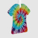 Photo of fabric dyed a bright, colourful rainbow spiral tie dye pattern on a tee shaped acrylic ornament.
