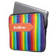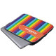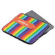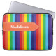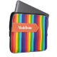 This bright rainbow striped pattern laptop sleeve has an orange banner ribbon with white stitching detail across the top. It is personalized with a name or whatever text you want to add.