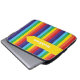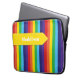 This bright rainbow striped pattern laptop sleeve has a yellow banner ribbon with white stitching detail across the top. It is personalized with a name or whatever text you want to add.