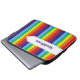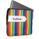 This bright rainbow striped pattern laptop sleeve has a white banner ribbon with rainbow colors stitching detail across the top. It is personalized with a name or whatever text you want to add.