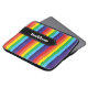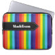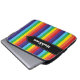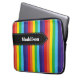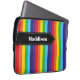 This bright rainbow striped pattern laptop sleeve has a black banner ribbon with white stitching detail across the top. It is personalized with a name or whatever text you want to add.