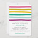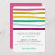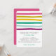 This colourful, modern invitation features rainbow coloured stripes on the front and a bright pink polka dot backer.
