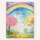 Pretty colourful notebook to write down and keep a note of your happy thoughts. Image is a rainbow and blue sky with clouds over rolling countryside with trees and pretty pink and yellow flowers. Write down your happy thoughts to help your mental health stay positive and give yourself motivation. Great book for kids, young adults or older adults. You can add a name by clicking on the personalize button. Change 'inside paper design' on the right of the image, choose from lined paper, bullet, sketch, graph, recipe, checklist and more.