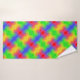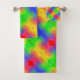 This colourful bath towel set presents an abstract spiral rainbow pattern swirling in colours of green, blue, yellow, orange and red.