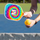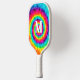 Be a stand out on the court with this retro style pickleball paddle with rainbow tie dye pattern. Personalize with with your desired name or initials.