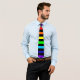 A multicoloured tie with alternating rainbow and black horizontal stripes.