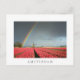 Postcard of a colourful rainbow in a dark sky over a windmill and a field full of bright red tulips during a spring storm in a landscape near Amsterdam in the Netherlands with a white border and the text: 'Amsterdam'.