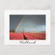 Postcard of a colourful rainbow in a dark sky over a windmill and a field full of bright red tulips during a spring storm in a landscape near Amsterdam in the Netherlands with a white border and the text: 'Holland'.