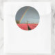 Round photo sticker of a colourful rainbow in a dark sky over a windmill and a field full of bright red tulips during a spring storm in a landscape near Amsterdam in the Netherlands.