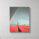 Vertical canvas landscape print of a colourful rainbow in a dark sky over a windmill and a field full of bright red tulips during a spring storm in a landscape near Amsterdam in the Netherlands.