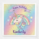 This cute and colourful custom party napkin features a beautiful illustration of a unicorn and pastel coloured rainbow, over a rainbow gradient background. Faux gold glitter accents the top and bottom portions. Little stars in matching colours surround the rainbow. A sample Happy Birthday banner is printed above the unicorn, and a sample name is printed below in an elegant purple script font. You can personalize the napkin to include your own custom name or text.