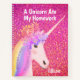 Keep up with your school work or notes in this Rainbow Unicorn Pink Glitter Glam Personalized Notebook. The front is designed with a white pretty unicorn. She has pastel rainbow hair and flowers on top of her head. The background is bright pink faux glitter and funny quote is, "a unicorn ate my homework" in bold white block lettering across the top. Name is in script lettering on right lower front. Click personalize template option and following the prompt.