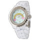 Add a touch of whimsy to your wardrobe with our Rhinestone White Enamel Watch. This enchanting timepiece features a delicate rainbow design on the face, with pink hearts at each end and little stars scattered around it, all set against a serene light blue background. The sparkling rhinestones on the bezel add a luxurious touch, making this watch both playful and elegant. Perfect for any occasion, this watch effortlessly combines charm and sophistication. The white enamel band ensures a comfortable fit, while the colourful design brings a cheerful and uplifting vibe to your day. Let this delightful watch be a reminder to always look for the rainbow after the rain.