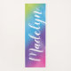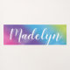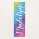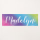 Modern vibrant coloured custom yoga exercise mat design features a diagonal rainbow watercolor gradient / tie dye style background with modern white script overlay text that can be personalized with your name or other wording. Colours include hot pink, violet purple, cyan blue, and lime green.