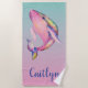 This beautiful towel features a rainbow watercolor whale with a blue and pink gradient background.