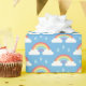 Cute rain clouds and rainbows and rain drops on a blue background. Perfect for a baby shower, easter, or a spring birthday party.