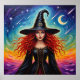 This whimsical poster features a mystical witch with flowing red hair and a black hat standing against a vivid cosmic sky, symbolizing magic, mystery, and the power of the night. Finished as an oil paint art print.