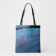 The artwork by ZoeSPEAK on this Tote Bag is an original closeup photograph of raindrops on a Manilla palm frond. The blue-tinted frond is curved, giving us views of the spacey blue water droplets from different angles. At the top of the curve we see a horizon of raindrops against the dark background. As the frond curves around, the droplets have bright highlights, and become smaller toward the underside in shadow.
