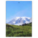 A view of Mount Rainier and surrounding green rolling hills on a sunny Spring day.