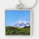 A view of Mount Rainier and surrounding green rolling hills on a sunny Spring day.