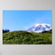 A view of Mount Rainier and surrounding green rolling hills on a sunny Spring day.