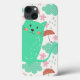 Raining Cats products for the home, office, and personal use with a cute, smiling, whimsical cat of teal, raindrops, umbrellas, and pink flowers!