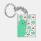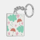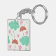 Raining Cats keychain with rain, umbrellas, polka dotted teal clouds, umbrellas, and a teal smiling cat!