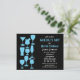 Celebrate the bride-to-be in style. A variety of cocktail, beer, and wine glasses in light blue silhouette against a rich black background striped with columns of white dots to make a rainy effect. Your customized text stands out in blue and white with other optional information printing on the back. Available in alternate colours.