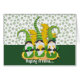 On the front of this cute St. Patrick's Day greeting card are three little gnomes, all dressed in their Irish greens! One holds a shamrock, one holds a gold coin, and one holds a lucky horseshoe. Behind them is a stack of gold bars, and a "rainfall" of green shamrocks. The text at the bottom says "Hoping it rains..." and the sentiment is continued with the inside text. All of the text is easily customized to anything you'd prefer.