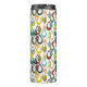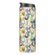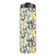 This thermal bottle has a mid-century modern design of raindrops with holes in retro colours repeated across the design on a field of white.