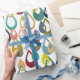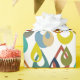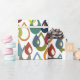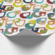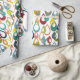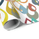 This wrapping paper has a mid-century modern design of raindrops with holes in retro colours repeated across the design on a field of white.