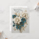 A wedding invitation with a raised floral design theme in turquoise, cream and gold.
