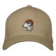 Fits well due to elastic edging, not adjustable. Good qualty material. Good quality embroidering. Subtle lettering (white on beige) just as my wife likes.
