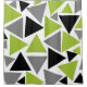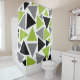 This modern shower curtain features an abstract geometric design of lime green, medium grey, and black triangles randomly arranged on a white background.
