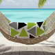 An abstract geometric design featuring lime green, medium grey, and black triangles randomly arranged on a white background. The perfect addition to your modern patio decor!