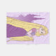 Rapunzel posing with her hair lifted off the ground with the tower silhouette in the background.