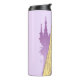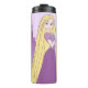 Rapunzel posing with her hair lifted off the ground with the tower silhouette in the background.