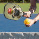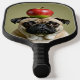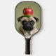 Carlin drôle avec une pomme équilibrant sur le dessus de sa tête.